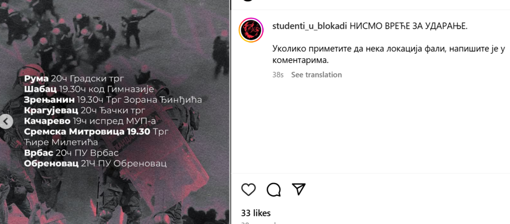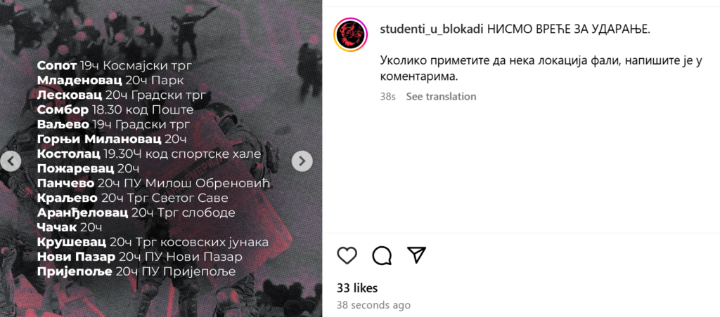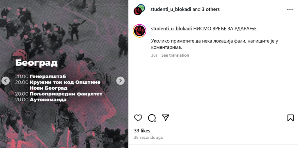 Studenti u blokadi objavili su lokacije na kojima će večeras biti održan protest.