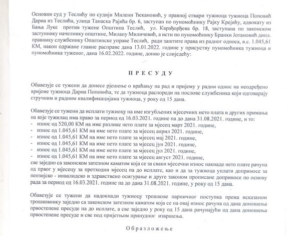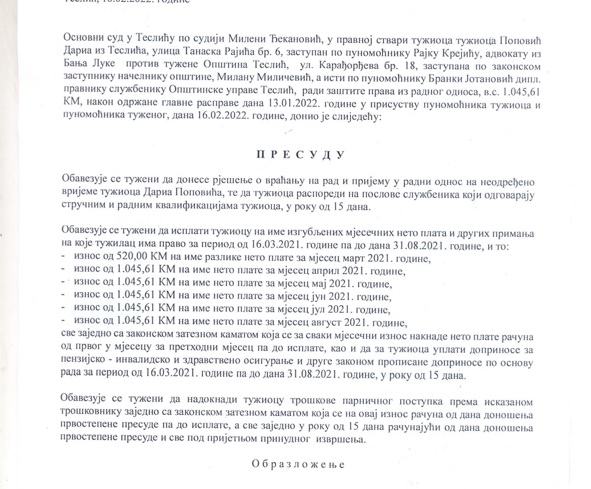 Tužilac smatra da je, nakon što je razriješen dužnosti sekretara SO Teslić, morao biti primljen u radni odnos kao službenik na neodređeno vrijeme. Obavezuje se tuženi da plati tužiocu izgubljene mjesečne neto plate i druga primanja – stoji u presudi koju potpisuje Milena Đekanović.