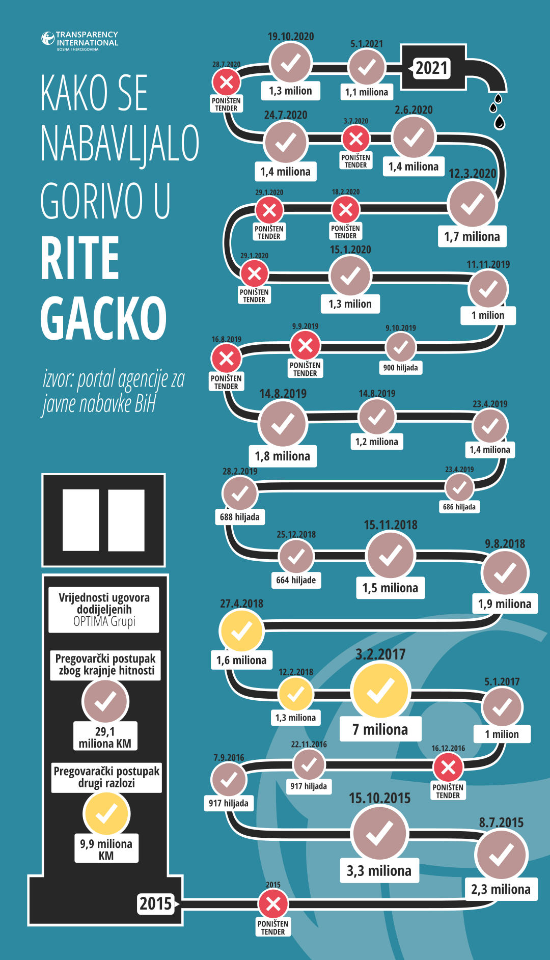 Transparency International u BiH (TI BIH) podnio je krivičnu prijavu protiv rukovodstva RITE Gacko koje je bez ikakvog javnog nadmetanja dodijelilo Optima Grupi posao nabavke goriva vrijedan 29,1 milion KM. Ugovori su dodijeljeni putem pregovaračkog postupka koji se može primjenjivati samo u izuzetnim slučajevima propisanim Zakonom o javnim nabavkama a objašnjenje za ovakav potez bar zvanično je „krajnja hitnost uzrokovana nepredvidivim događajima“.