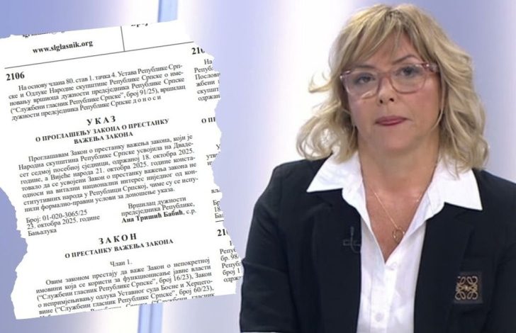"Proglašavam Zakon o prestanku važenja zakona, koje je Narodna skupština Republike Srpske usvojila na Dvadeset sedmoj posebnoj sjednici, održanoj 18. oktobra 2025. godine, a Vijeće naroda 21. oktobra 2025. godine konstatovalo da se usvojeni Zakon o prestanku važenja zakona ne odnosi na vitalni nacionalni interes nijednog od konstitutivnih naroda u Republici Srpskoj, čime su se ispunili formalno-pravni uslovi za donošenje ukaza", stoji u Službenom glasniku Republike Srpske uz potpis Ane Trišić Babić, vršioca dužnosti predsjednika Republike.