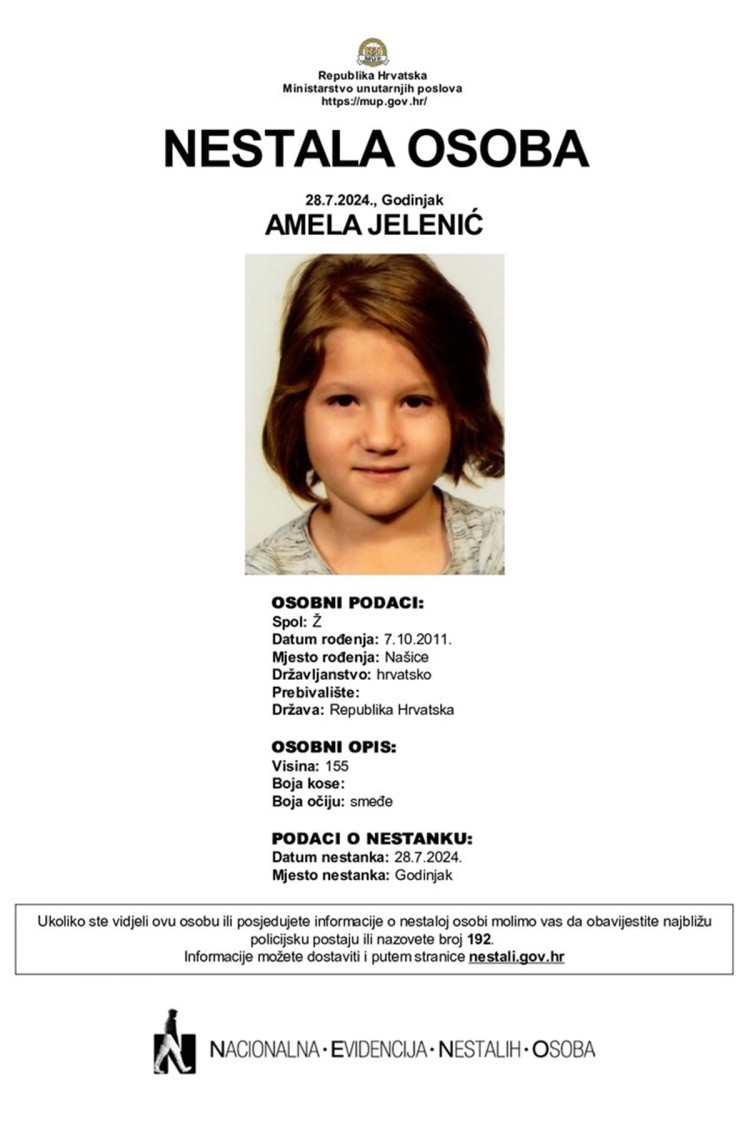 U mestu Godinjak kod Nove Gradiške u nedjelju je nestala 12-godišnja djevojčica Amela Jelenić, saopšteno je danas iz Ministarstva unutrašnjih poslova Hrvatske, uz poziv svim građanima, da, ako raspolažu bilo kakvom informacijom o ovom djetetu, kontaktiraju najbližu policijsku stanicu.
