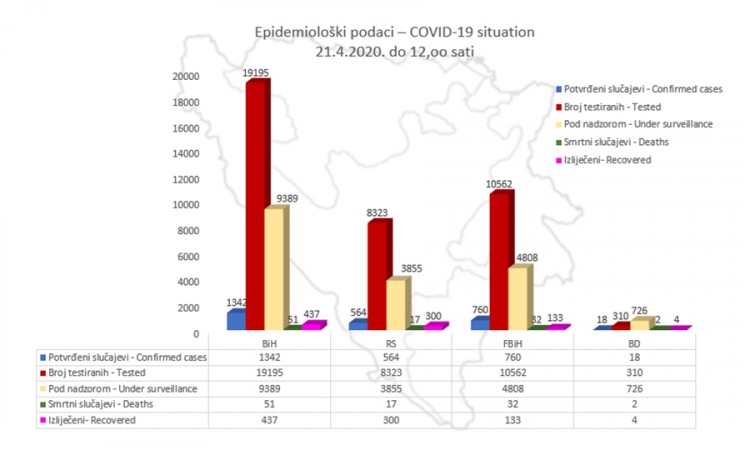 U Bosni i Hercegovini je od početka pandemije registrovano 1.342 slučaja zaraze virusom korona, a izliječeno je do sada 437 ljudi.