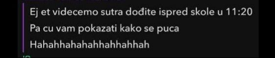 Navodna prepiska učenika pojavila se na društvenim mrežama, a đak je navodno napisao" Dođite sutra ispred škole u 11.20 sati, pa ću vam pokazati kako se puca" odgovarajući na navod „da nikad u životu vjerovatno nije vidio pištolj, a kamoli da zna kako se puca”. Ostali su se na to nadovezali, govoreći da će donijeti lažni pištolj te da „ne žele trošiti vrijeme na osobu koja laže”.
