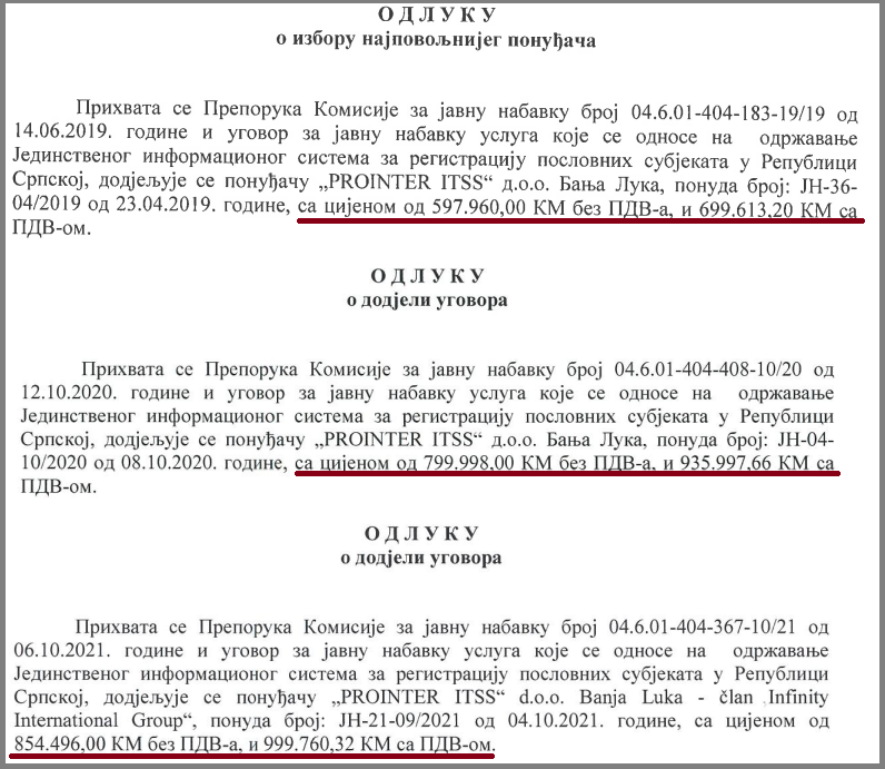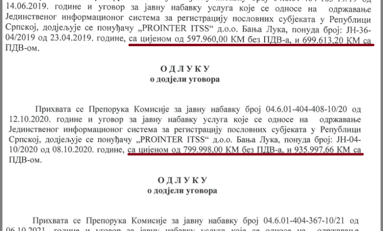 Inače, „Lanaco“ je firma koja je kreirala i godinama održavala jedinstveni informacioni sistem za registraciju poslovnih subjekata, sve do 2019. godine, kada je ovaj posao dodijeljen „Prointeru“.