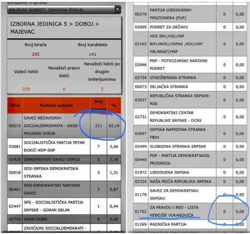 Nosilac liste Za pravdu i red Nebojše Vukanovića u Doboju i Izbornoj jedinici 5 Bojana Radović podijelila je na svom fejsbuk profilu rezultate izbora u Majevici gdje se vidi da ova politička opcija nije osvojila nijedan glas.