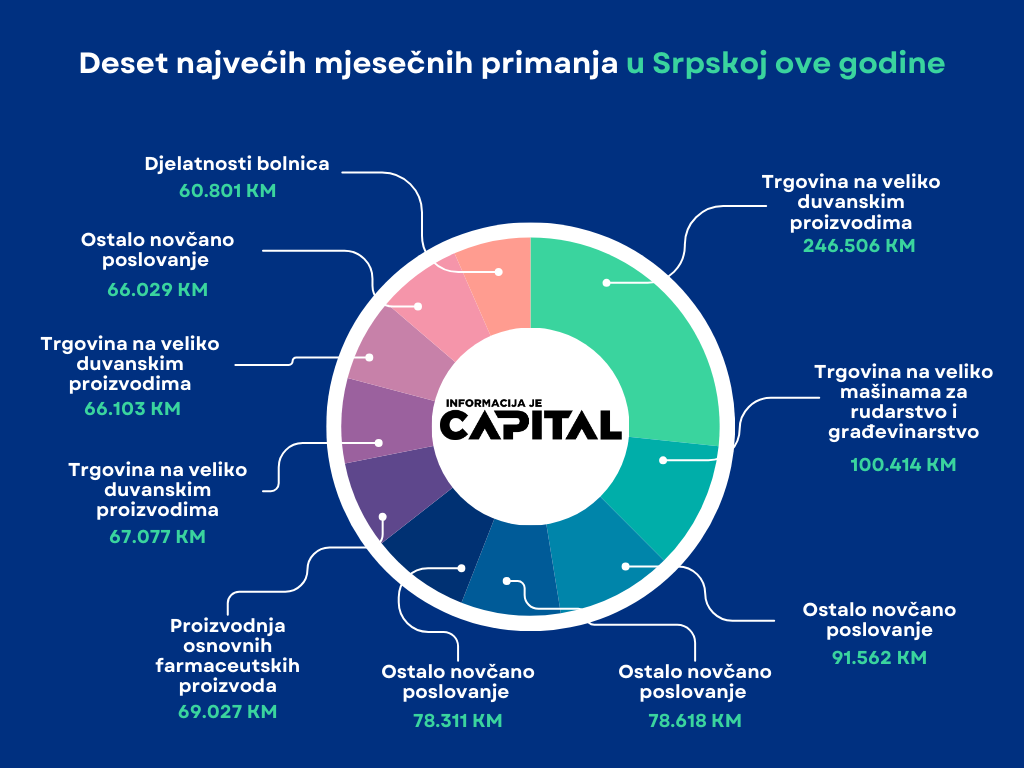Prema podacima Poreske uprave RS među deset najvećih prijavljenih pojedinačnih neto primanja po osnovu radnog odnosa u prvih pet mjeseci dominira upravo ova djelatnost te ostalo novčano poslovanje ili posredovanje.