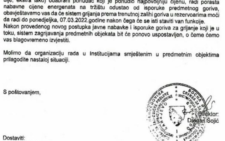 Dopis ove službe u posjedu je "Nezavisnih novina" i u njemu se navodi da je odabrani ponuđač za nabavku energenata za grijanje, koji je ponudio najpovoljniju cijenu, radi porasta nabavne cijene energenata na tržištu odustao od isporuke.