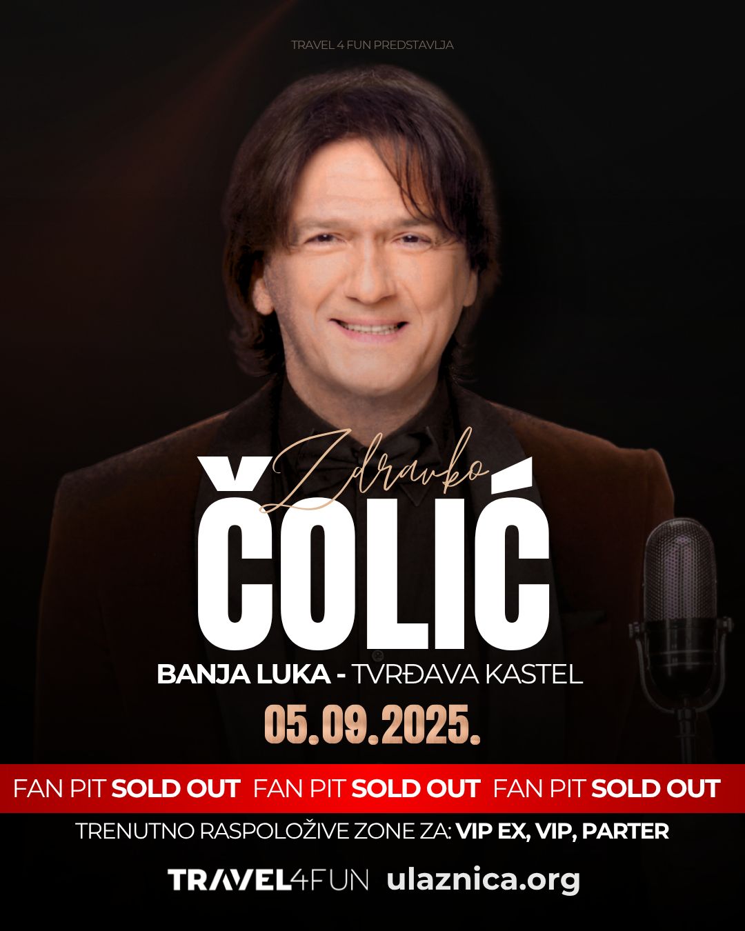 Fan pit zona za veliki koncert Zdravka Čolića zakazan za 5. septembar na banjalučkoj tvrđavi Kastel – planula je! Ulaznice za najtraženiji prostor ispred bine rasprodane su brzinom svjetlosti, a to je najbolja najava onoga što nas čeka – koncert koji se ne propušta!
