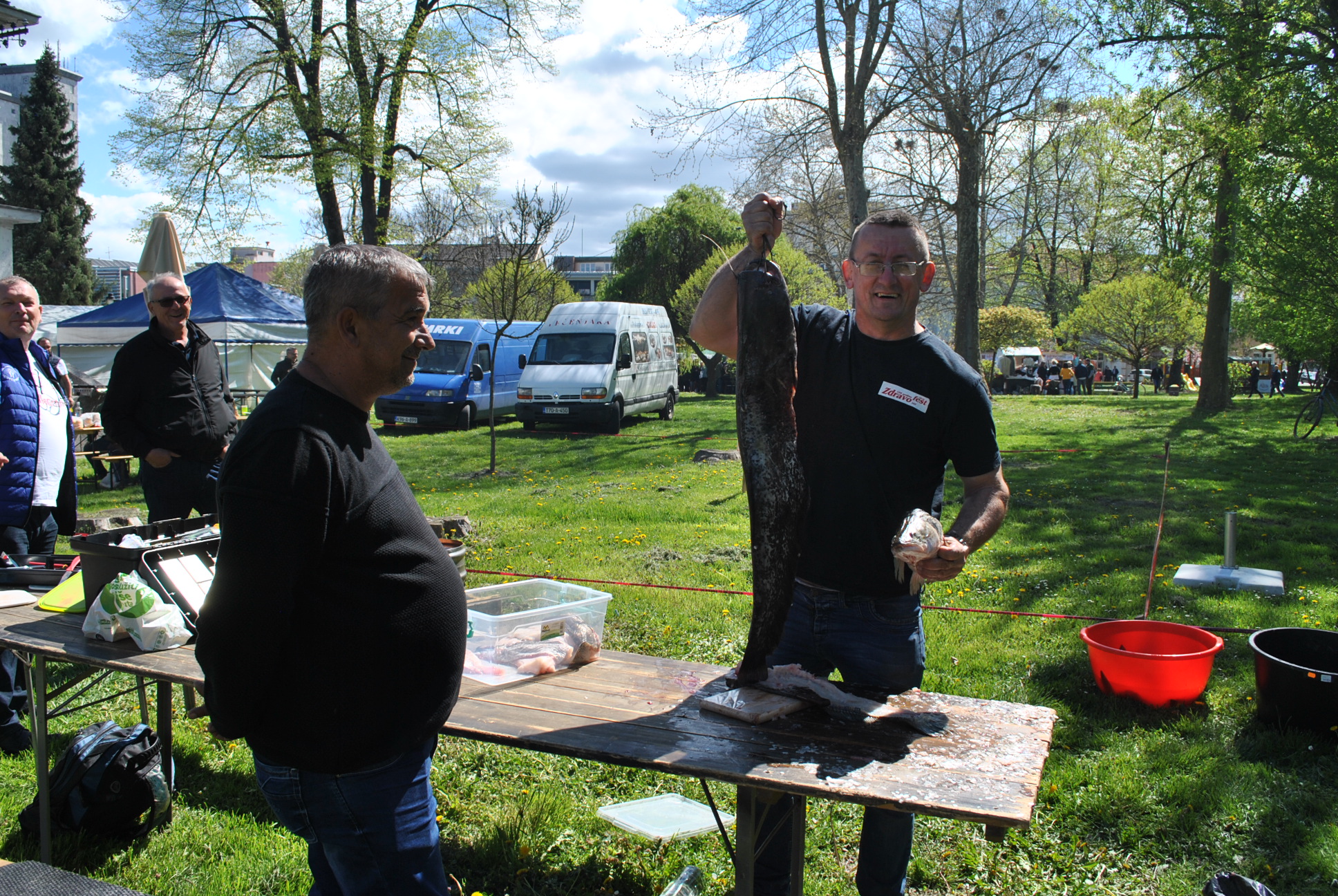 Dragolav Šinik Šiljo napravio je međunarodni štand. Došli su mu gosti iz Srbije i Crne Gore. Na stolu su poveći komadi soma, smuđa, šarana i mrene.