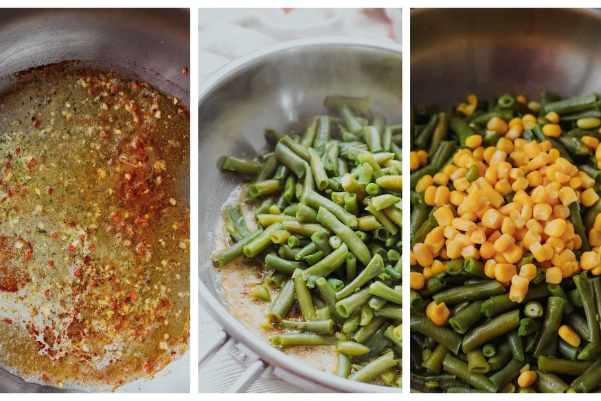 U tavi otopiti veći kocku maslaca, pa dodati vegetu i crvenu papriku. Kada se blago uprži dodati mahune i konzervisan kukuruz šećerac.