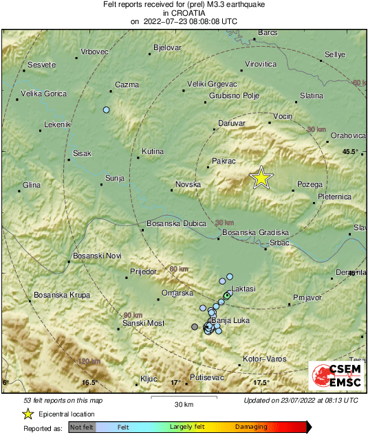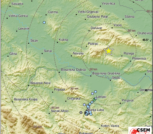 EMSC je prvo saopštio da je epicentar na oko 10 kilometara od Banje Luke, ali je naknadno saopšteno da je epicentar bio 16 kilometara od Požege u Hrvatskoj.