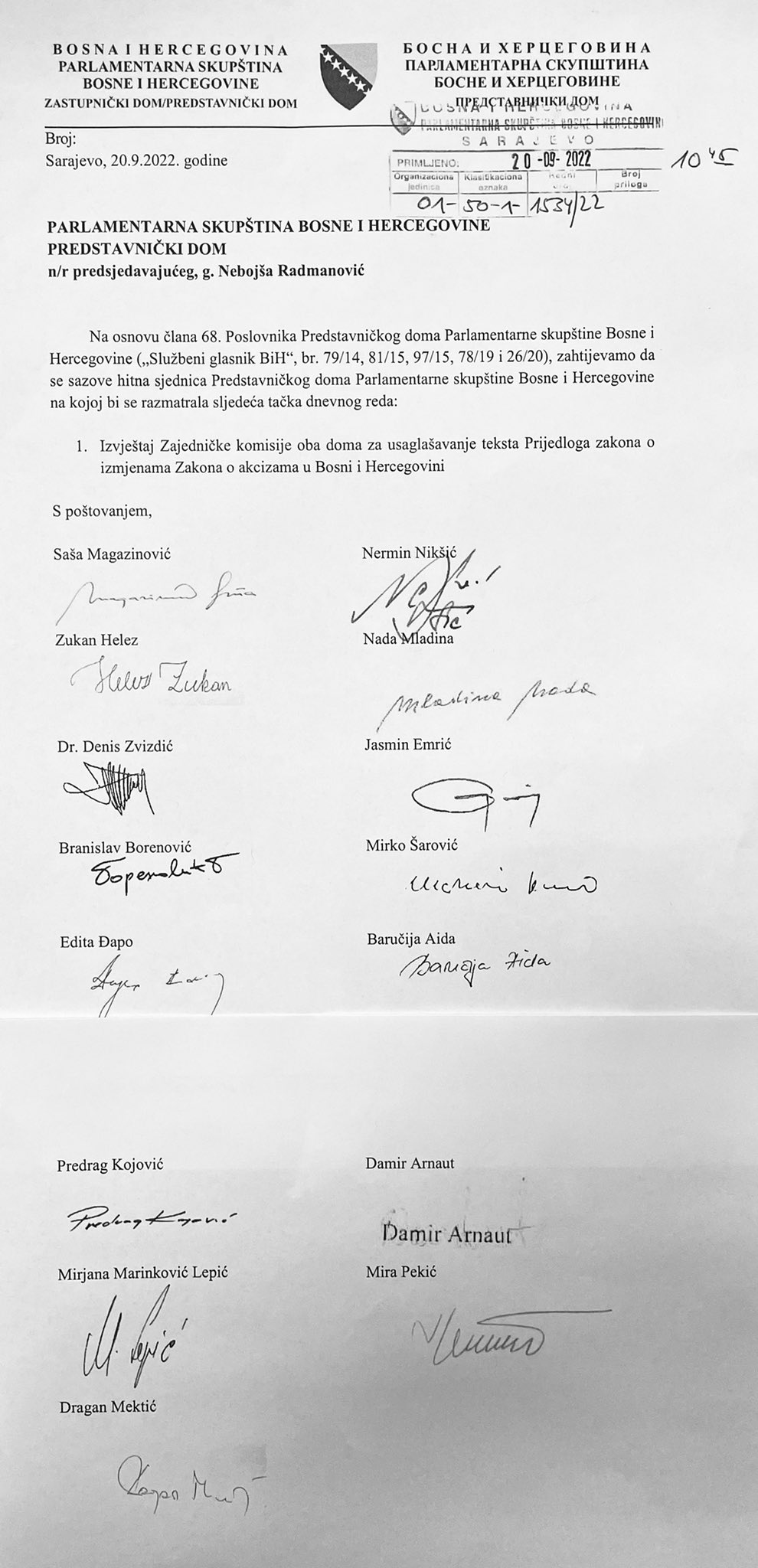 Poslanici Predstavničkog doma i delegati Doma naroda Parlamentarne skupštine BiH predali su potpise za sazivanje posebne sjednice oba doma na kojima bi se razmatralo ukidanje akciza na naftu i naftne derivate.